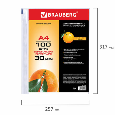 Папки-файлы перфорированные, А4, BRAUBERG, комплект 100 шт., матовые, 30 мкм, 221991