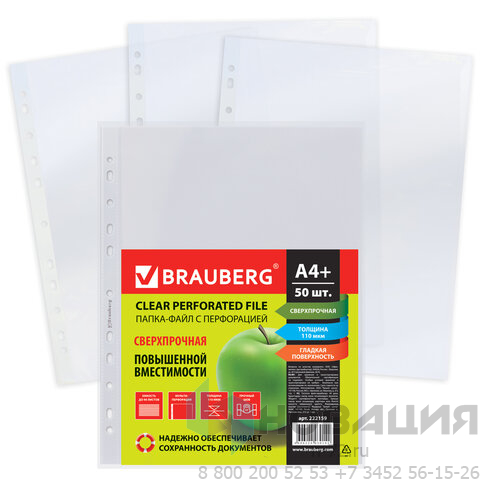 Папки-файлы перфорированные А4+ BRAUBERG, КОМПЛЕКТ 50 шт., гладкие, СВЕРХПРОЧНЫЕ, 110 мкм, 222159