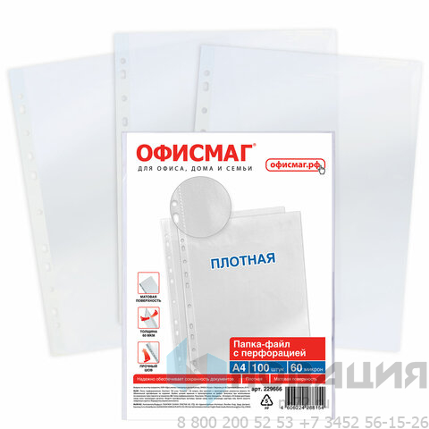 Папки-файлы перфорированные А4 ОФИСМАГ, КОМПЛЕКТ 100 шт., матовые, ПЛОТНЫЕ, 60 мкм, 229666