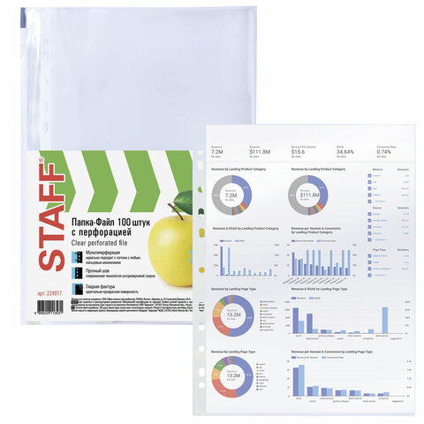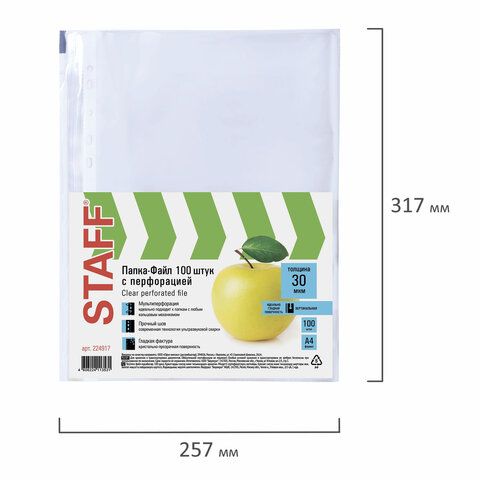 Перфопапки формата А4 с вертикальным размещением содержат универсальную перфорацию, а также имеют гладкую поверхность и прочные швы. Толщина пленки – 30 мкм, что подходит для хранения до 20 листов в 1 папке-файле. В комплекте 100 шт.