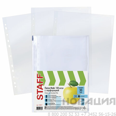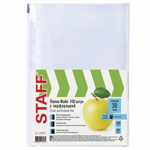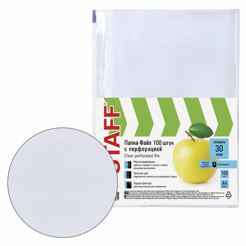 Папки-файлы перфорированные, А4, STAFF "Basic", КОМПЛЕКТ 100 шт., гладкие, "Яблоко", 30 мкм, 224917