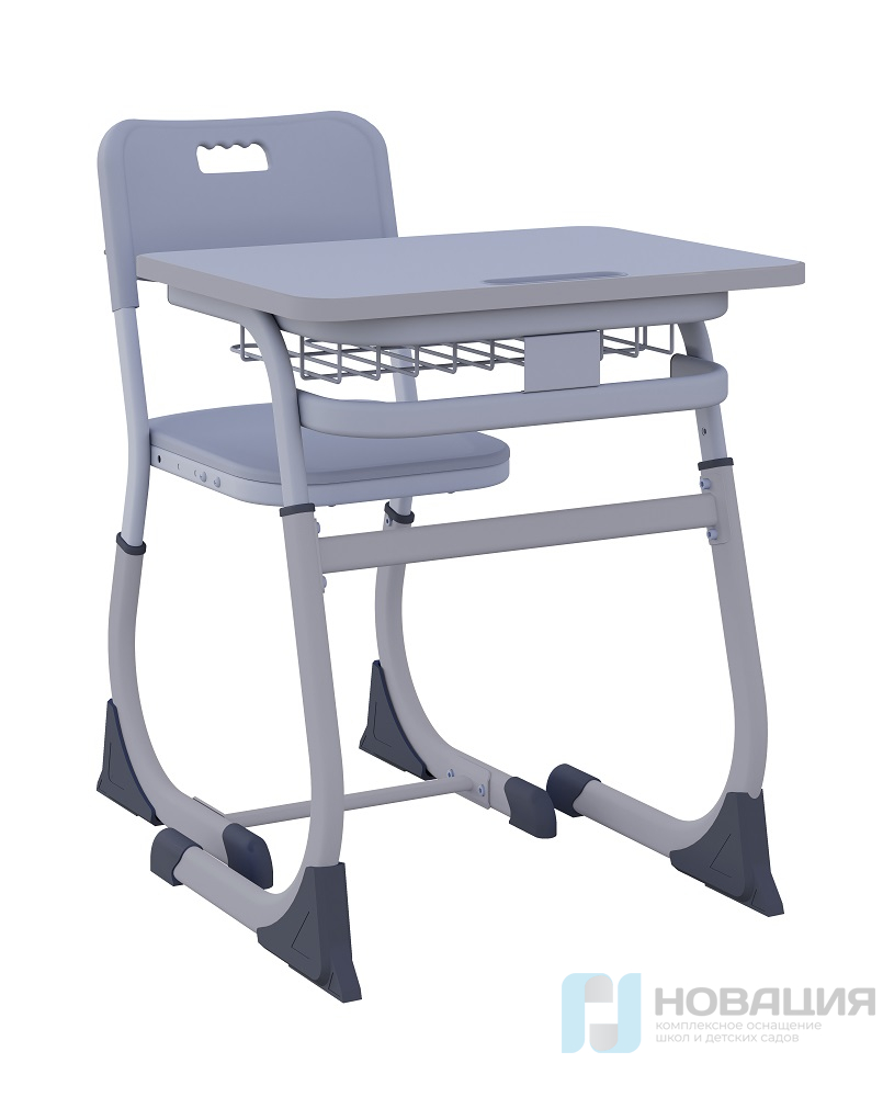 Парта регулируется по высоте. Сборно-разборный каркас парты изготовлен из стальных плоскоовальных труб и состоит из пояса, двух стоек, перемычки и двух опор. Стойки крепятся к поясу при помощи винтов. Опоры вставляются в нижнюю стойку и стягиваются между собой. Столешница крепится при помощи металлических уголков, под ней размещается корзина для книг и канцелярии (размеры ШхГхВ - 475х310х100мм).