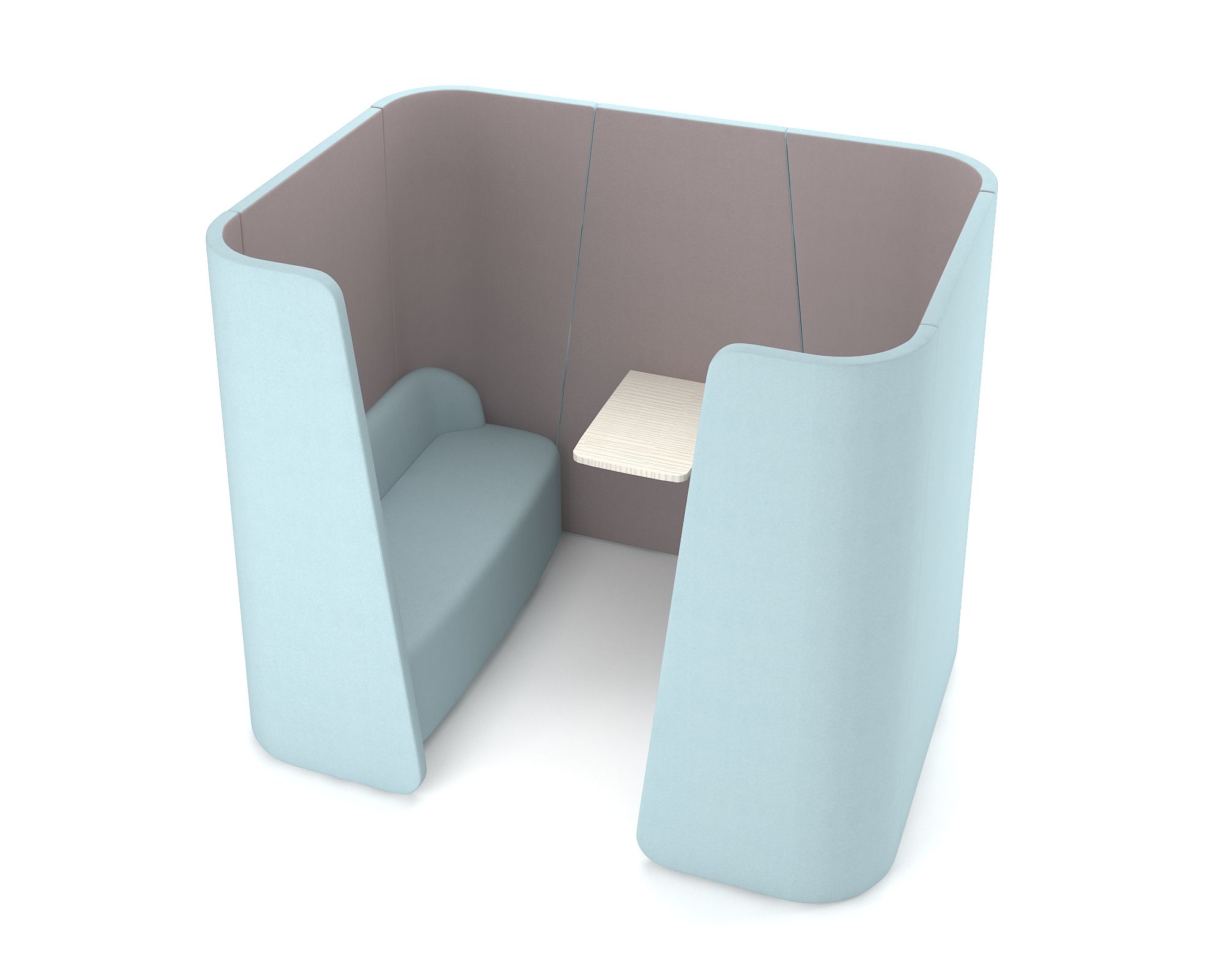 Переговорной зоной со столиком оборудуются помещения для отдыха, коворкинги, читальные залы. Участок площадью 3,12 кв.м с 4-х сторон огораживается вертикальными панелями. На одной стороне предусмотрен вход, вдоль 2-х других стоят мягкие диваны со спинками (по 1 шт.). Между ними к стенке монтируется столешница из ЛДСП (25 мм) с закругленными углами. Перегородки поглощают шум. Обивка выдерживает не менее 20000 циклов истирания.