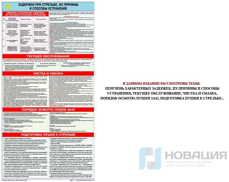 Плакат без иллюстраций включает информацию о характерных задержках при стрельбе, их причинах и способах устранения, порядке осмотра пушки 2А42 и ее подготовки к стрельбе. Покрыт двухсторонней ламинированной пленкой.