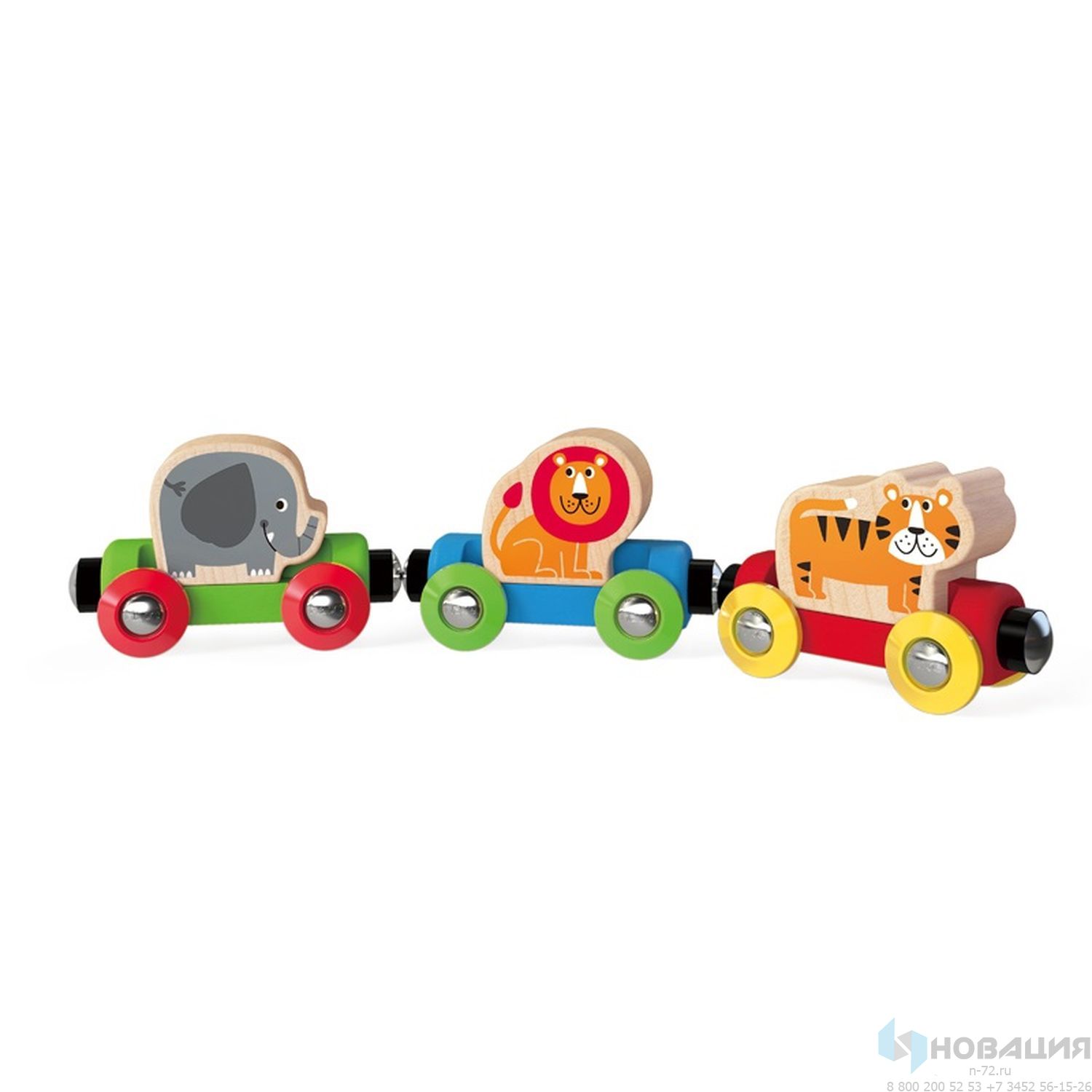 В комплект входят три вагончика и три фигурки животных (лев, тигр, слон). Вагончики легко соединяются друг с другом при помощи магнитной сцепки. Игрушка способствует развитию мелкой моторики и координации движений, навыка распознавания цвета.