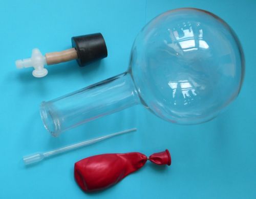 Горловина колбы закупорена резиновой пробкой, имеющей осевое отверстие, в котором запрессована трубка с насаженным на нее краном. Стенки колбы выполнены из термостойкого стекла, утолщены, поэтому ничто не мешает проведению безопасных опытов, которые приводят к интересным результатам.