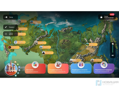 В блоке «Карта России» на главный экран выводится интерактивная карта, на которой отмечены субъекты РФ, города, культурные и природные достопримечательности, объекты промышленности, природные ископаемые, уникальная флора и фауна. При нажатии на иконку субъекта появляется визуальная и звуковая информация о нем.