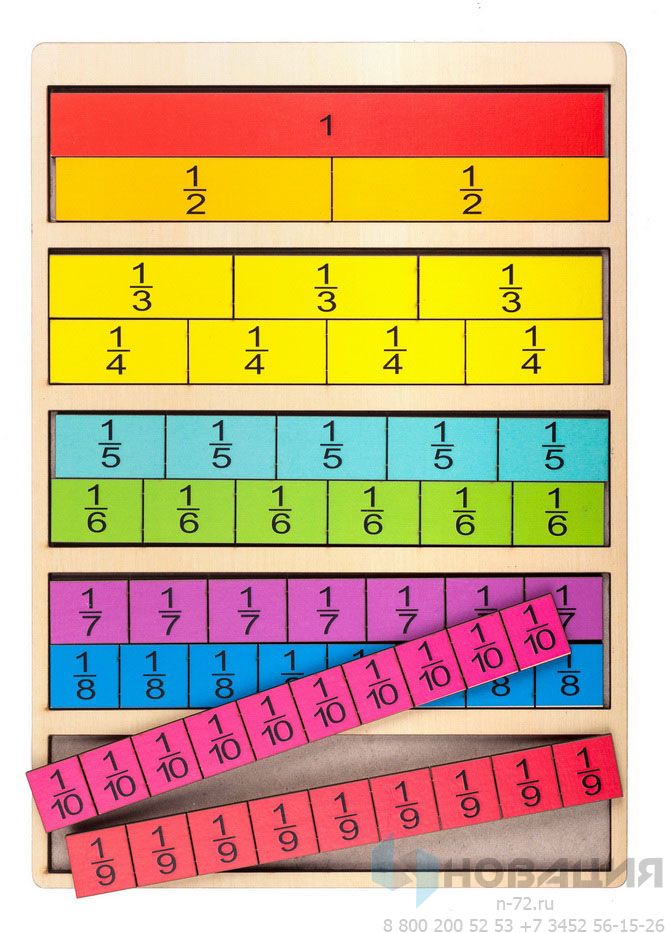 Представляет собой панель с большим прямоугольником (единица) и более мелкими (дроби). Позволят наглядно и в игровой форме изучить с детьми части единицы, подготовить их к математическим задачам. Рекомендуется для детей старшего дошкольного возраста, подготовительных групп и начальной школы.
