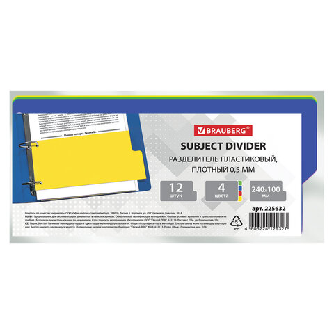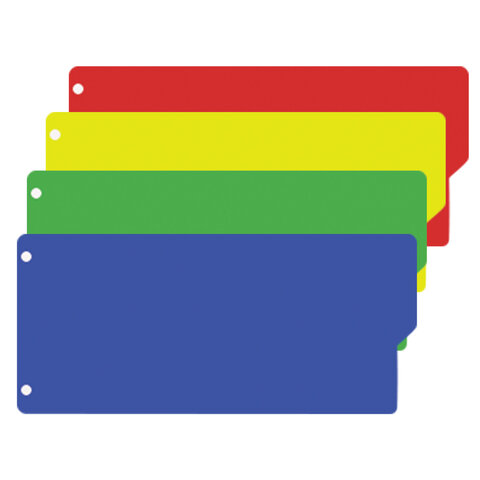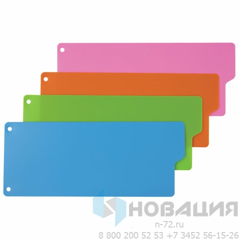 Изготовлены из пластика толщиной 0,5 мм. В комплект входят 12 листов размером 100х240 мм синего, оранжевого, зеленого и розового цвета, обеспечивающих возможность сортировки документов по цветам. Универсальная перфорация позволяет подшивать разделители во все типы папок.