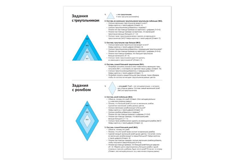 Развивающая игра-пособие рекомендована для детей от 4 до 7 лет. Она поможет детям в обучении счету до 20, познакомит с цифрами и математическими знаками, научит складывать и вычитать. Дети получат необходимую дошкольную подготовку по математике и геометрии, благодаря задачам на составление подобных треугольников и ромбов.