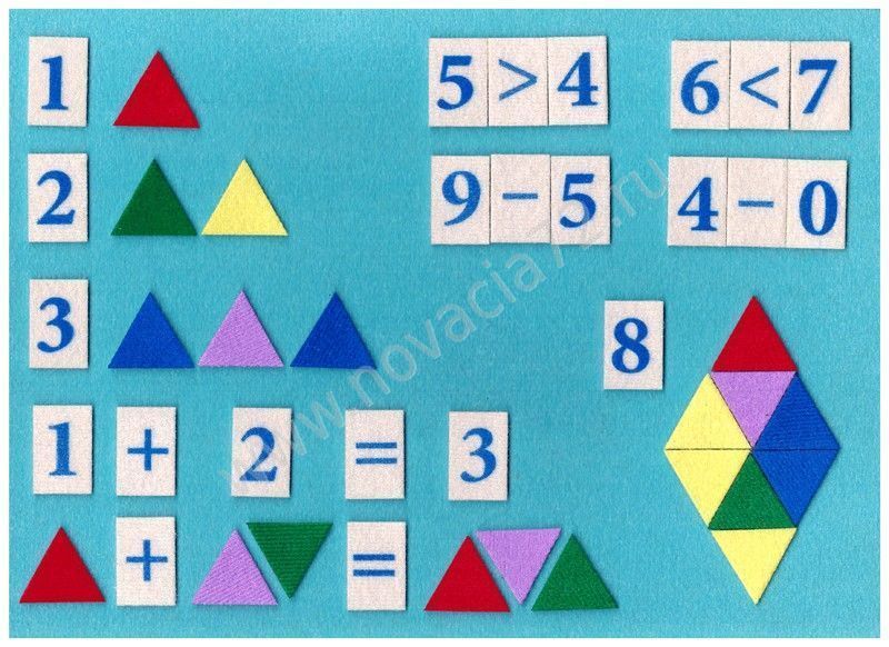 Размер: Фон - 21х30 см; Цифры - 15 шт; Математические знаки - 8 шт; Треугольники из ткани вырезные трехслойные - 20 шт.