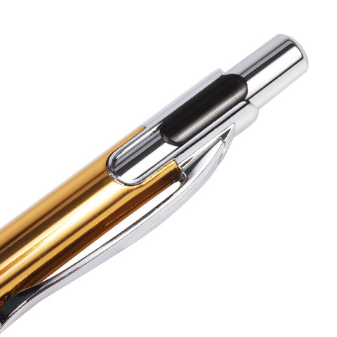 Корпус ручки выполнен из металла и декорирован серебряными деталями. Стержень типа "Parker" имеет длину 98 мм. Диаметр пишущего узла, равный 1 мм, создает линию письма, равную 0,7 мм. Нажимной механизм обеспечивает комфортное использование. Поставляется в нескольких вариантах цвета корпуса (без возможности выбора).