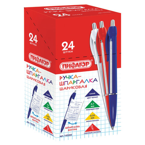 Ручка шариковая автоматическая ПИФАГОР "Шпаргалка", СИНЯЯ, корпус ассорти, узел 0,7 мм, линия письма 0,35 мм, 143285