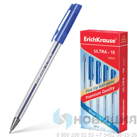 Ручка шариковая масляная ERICH KRAUSE "Ultra-10", СИНЯЯ, корпус прозрачный, узел 0,7 мм, линия письма 0,26 мм, 13873