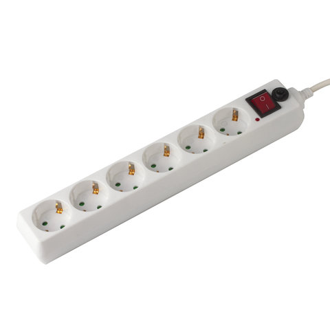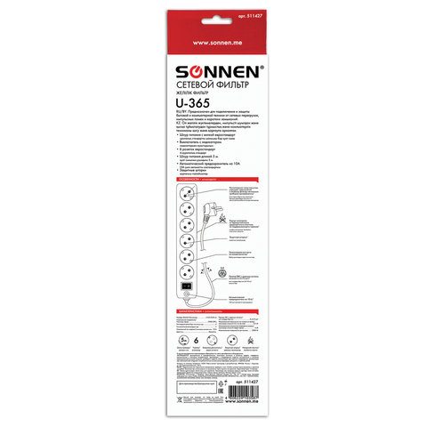 Сетевой фильтр SONNEN U-365, 6 розеток, с заземлением, выключатель, 10 А, 5 м, белый, 511427