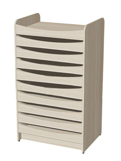 Прямой фасад с цоколем оснащается 5-ю выдвижными отделениями с бортиками. Содержимое каждого ящика частично открыто для читателя. Поверхность топа используется для выставки экземпляров и работы с газетами.