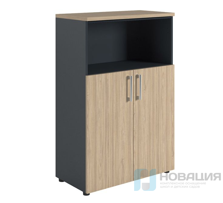 Эргономичность обеспечивается удобными металлическими ручками. Полки выполнены из ЛДСП толщиной 18 мм и закреплены надежным зажимным механизмом. Черные пластиковые ножки диаметром 50 мм, высотой 30 мм, регулируются по высоте для адаптации к неровностям поверхности.