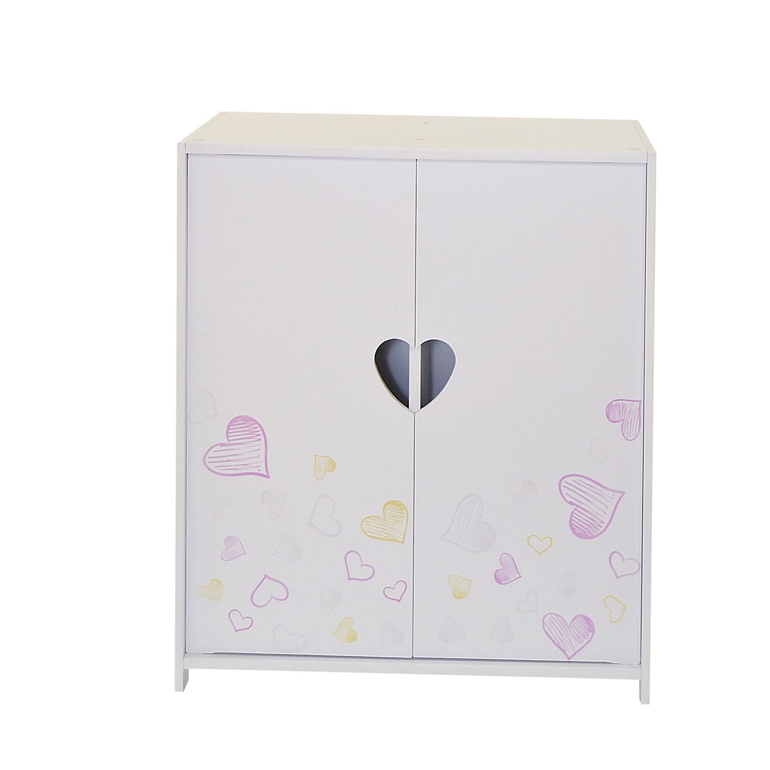 Подойдёт для игры с куклами высотой до 45 сантиметров. Внутри шкафа расположены два отделения, подходящие для хранения различных кукольных аксессуаров: одно - с перекладиной, другое - с тремя полками. Ручки шкафа выполнены вырубкой в форме сердца.