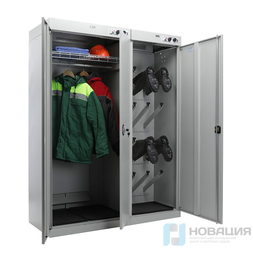 Внутреннее пространство позволяет разместить тяжелые элементы снаряжения и спецодежды: полка выдерживает нагрузку до 10 килограммов, а одежда на перекладине рассчитана на вес до 50 килограммов. Специальные резиновые поддоны, идущие в комплекте, обеспечивают защиту от влаги и загрязнений.