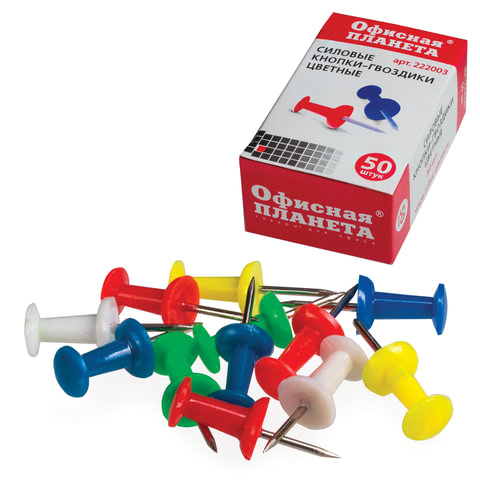 Силовые кнопки-гвоздики ОФИСНАЯ ПЛАНЕТА, цветные, 50 шт., в картонной коробке, 222003
