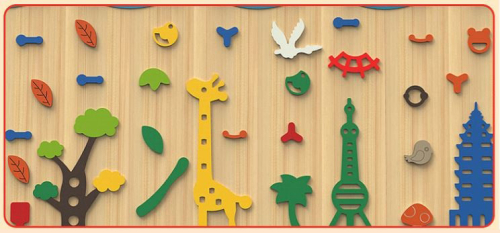 Скалодром включает три секции размером по 1000х2200 мм. Каждая секция состоит из двух панелей. Разноцветные упоры изготовлены в виде животных, растений. Крепления входят в комплект, допустимая нагрузка на скалодром 500 кг.