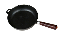 Круглая сковорода с сэндвич-дном подходит для любых плит. Посуда нагревается равномерно и быстро. Ручка с отверстием крепится точечной пайкой.