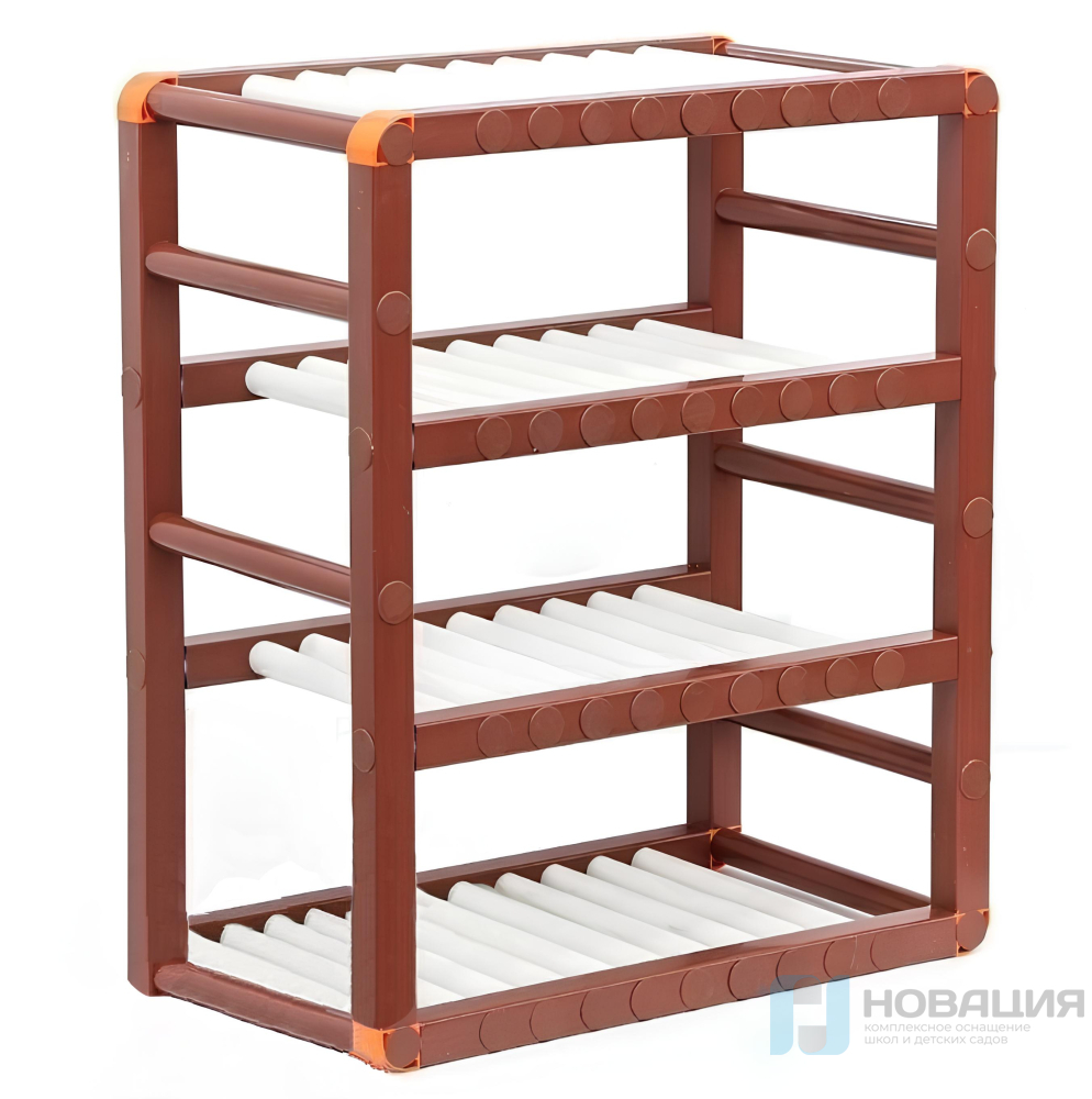 В стеллаже для бассейна, спортивного или тренажерного зала хранятся емкости с водой. Корпус на прямоугольном основании легко сдвигается. Бутылки фиксируются на 4-х рельефных полках из трубок. Угловые соединения каркаса оснащены заглушками, углы сглажены.