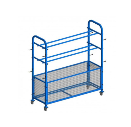 Верхняя зона оборудована 2-мя полками, предназначенными для удобного расположения мячей различного типа. Торцы конструкции снабжены 8-ю прочными крючками для компактного размещения скакалок, гимнастических обручей и аналогичных аксессуаров. В нижней части размещен вместительный металлический сетчатый ящик, предназначенный для надежного хранения дополнительного инвентаря.