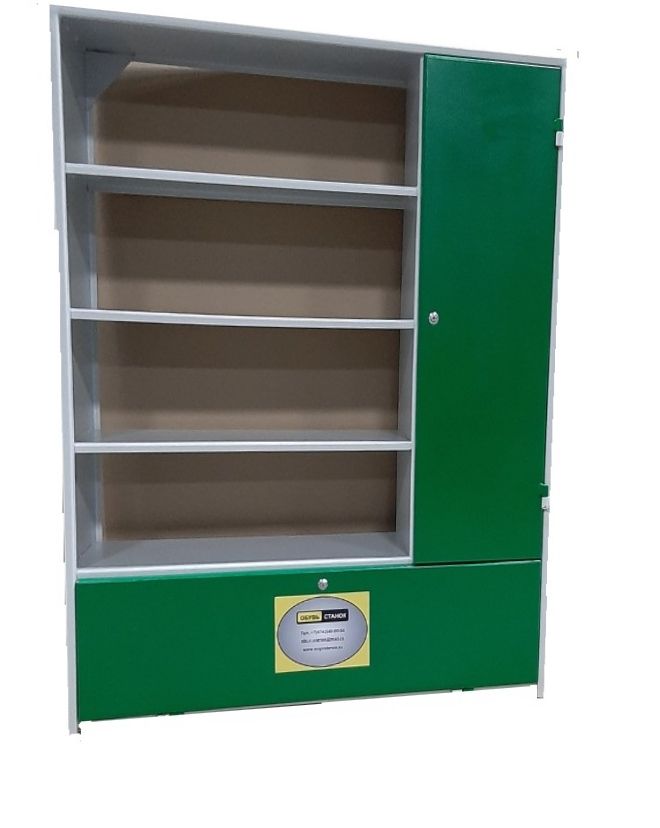 На полках расставляется обувь, которую приняли в ремонт или уже починили. Вертикальное отделение подходит для одежды, внутри предусмотрены крючки.