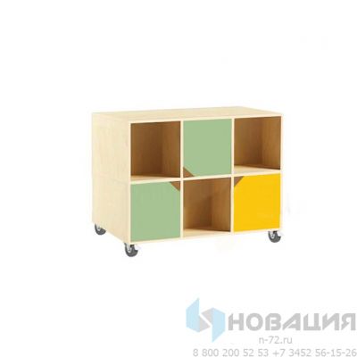Стеллаж состоит из 3-х вертикальных секций с квадратными отделениями. Створки закрытых ячеек распахиваются в разные стороны. 3 отделения (расположенные в шахматном порядке) не имеют дверц. Задняя сторона мебели выполнена из ЛДСП. Топ служит дополнительной полкой. Поверхности отшлифованы, торцы облицованы кромкой. Колеса усиленные прорезиненные. Предусмотрен поворотный механизм и стопоры.