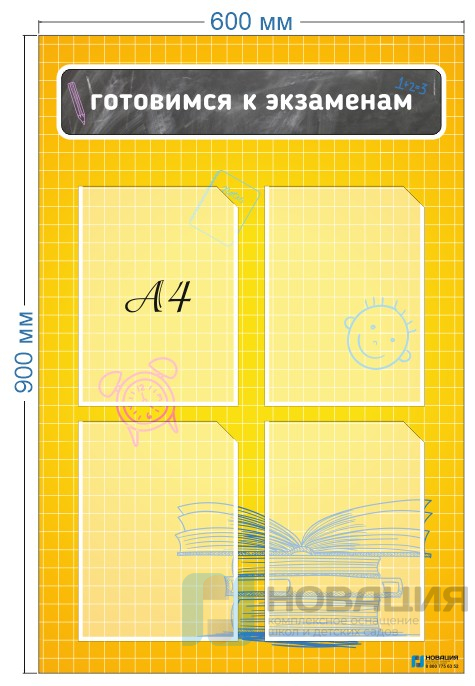На выбор предоставляется несколько вариантов оформления. На стенде есть четыре специальных кармана A4. В них можно поместить всю информацию о подготовке к экзаменам.