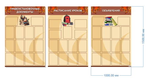 Набор состоит из трех стендов: “Правоустанавливающие документы”, “Расписание уроков”, “Объявления”. Оснащен большим количеством вертикальных и горизонтальных отделений для размещения важной информации. Карманы крепятся на двусторонний скотч.