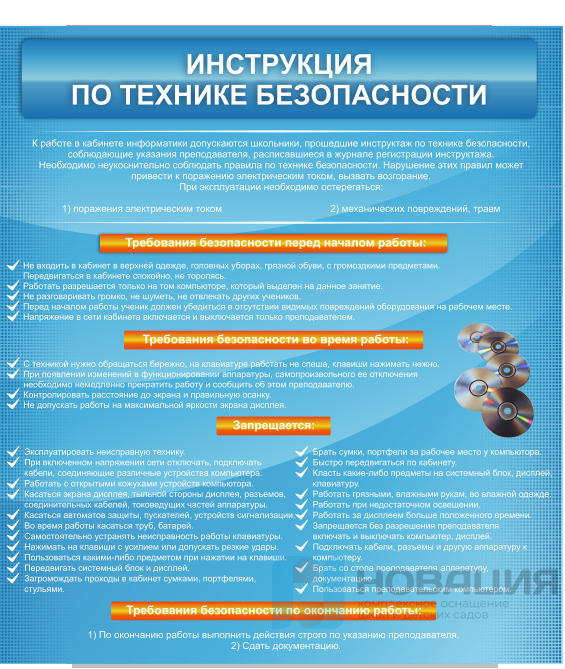 Стенд, посвященный правилам работы за компьютером, размещается в кабинете информатики в школе. Подготовка к эксплуатации, основные угрозы безопасности, как и действия по окончанию работы с техникой, описаны в тексте, напечатанном на качественной пленке.