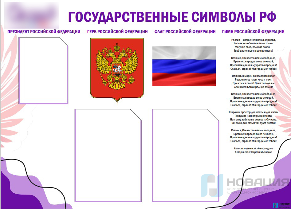 Стенд содержит текст гимна РФ, изображения флага и герба. Карманы можно заполнять справочной или другой важной информацией.