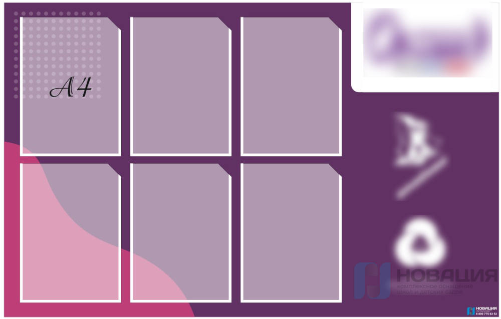 Стенд оснащен шестью вертикальными карманами формата А4, в которых можно размещать объявления, фотографии, важную информацию.