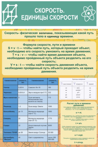 Стенд содержит определение скорости, основные формулы и единицы измерения. Также приведена справочная информация о скорости молекул, животных, некоторых видов транспорта. Содержит цветные иллюстрации.