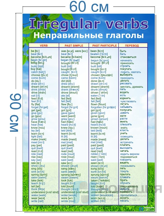 На выбор предоставляется несколько вариантов со следующим содержанием: "Который час", "Неправильные глаголы", "Правила чтения в английском языке", "Предлоги", "Настоящее совершенное время", "Таблица всех времен", "Фрукты, овощи", "Гостиная". Стоимость указана за 1 шт.