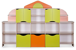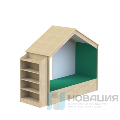 Стенка выполнена в виде домика. Передняя и часть задней стороны открыты. Внутри расположено место для сиденья. В боковой части есть 5 полок для хранения книг и игрушек.