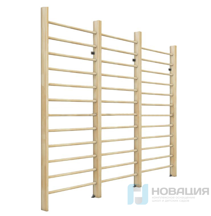 Шведская стенка трехсекционного типа включает три одинаковые секции размером 800х2400 мм, каждая из которых выполнена в виде сборной конструкции из двух деревянных стоек и поперечных перекладин. Конструкция изготовлена из натуральной древесины.