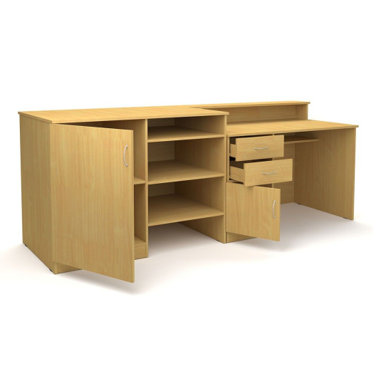 Опыты демонстрируются на 2-х разноуровневых рабочих поверхностях. Стол дополняется приставкой с одним горизонтальным отделением, нижней полкой, 2-мя выдвижными ящиками, закрытыми отделениями с дверцами и фурнитурой на створках, 3-мя полуоткрытыми отделениями.