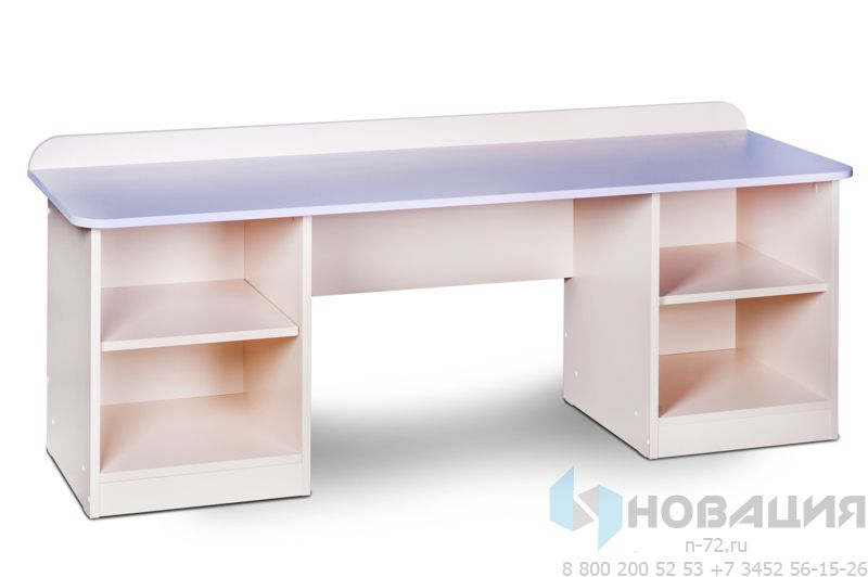 Изделие выполнено из прочных и нетоксичных материалов. Располагает 4-мя просторными горизонтальными отделениями, расположенными друг под другом по обе стороны от ниши под столешницей. Конструкция укреплена царгой. Аккуратная столешница спереди дооформлена бортиком, благодаря которому предметы не падают со стола.