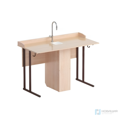 Стол оснащен тумбой под сантехнику, водоразборной колонкой и сливной раковиной. Есть два крючка для сумок и портфелей.