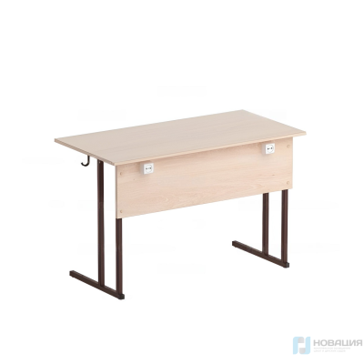 Столешница из ЛДСП облицована химически стойким пластиком, торцы обрамлены кромкой ПВХ 2 мм. Столешница размещается на основе методом скрытого крепления. Стол оснащен двумя электрическими розетками 42V, для электропроводки в каркасе предусмотрены отверстия. Предусмотрены два крючка для портфелей. Каркас стола имеет полимерные подпятники, которые предотвращают повреждение напольных покрытий.