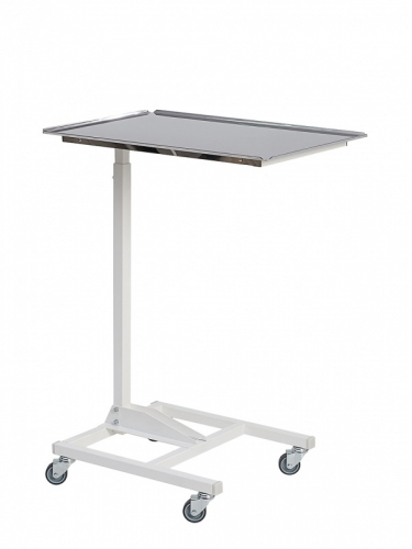 Телескопическое устройство каркаса позволяет регулировать высоту от 790 до 1250 мм. Каркас столика изготовлен из стального профиля, покрыт экологически чистым, эпоксидным полимерно-порошковым покрытием, устойчивым к регулярной обработке всеми видами медицинских дезинфицирующих и моющих растворов.