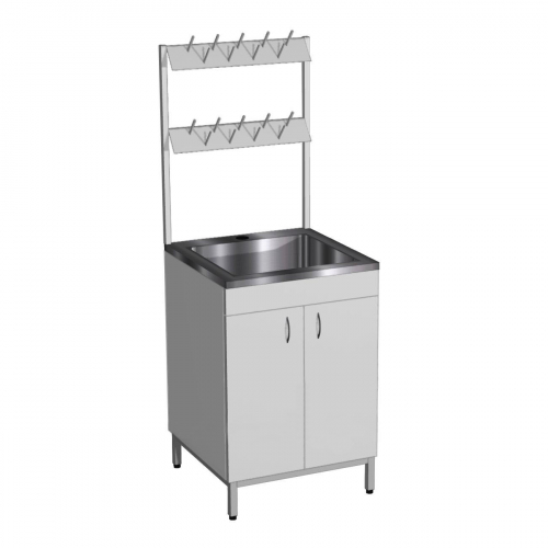 Стол с мойкой и сушкой с крючками предназначен для очищения лабораторной посуды. Изготовлен из материалов, устойчивых к средствам дезинфекции. На концах ножек есть заглушки. Опоры регулируются в пределах 20 мм.