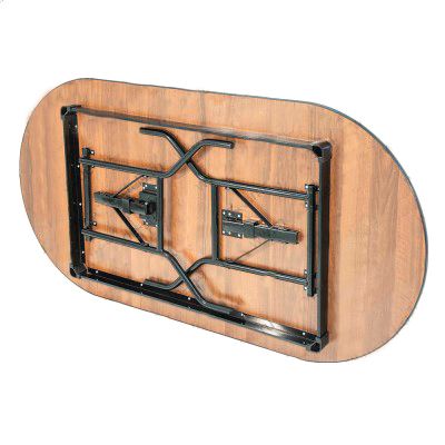Обеденный стол с имитацией рисунка ценной породы дерева легко складывается. Покрытие меламиновой пленкой выдерживает УФ-лучей. 2 пары ножек с колпачками не царапают пол. Удаленность опор от края столешницы позволяет сидеть с 4-х сторон.