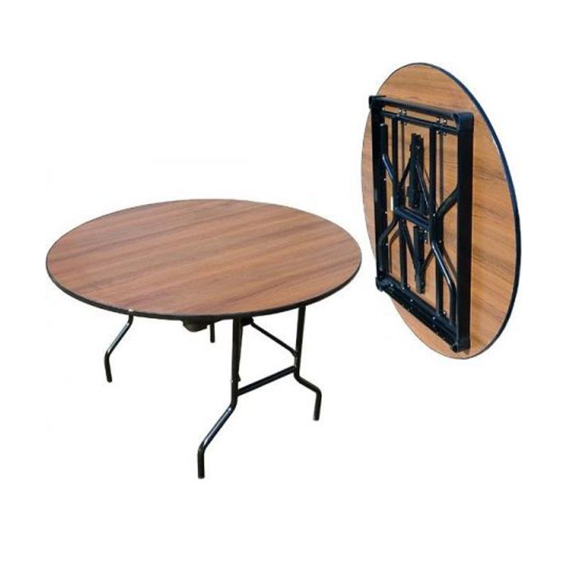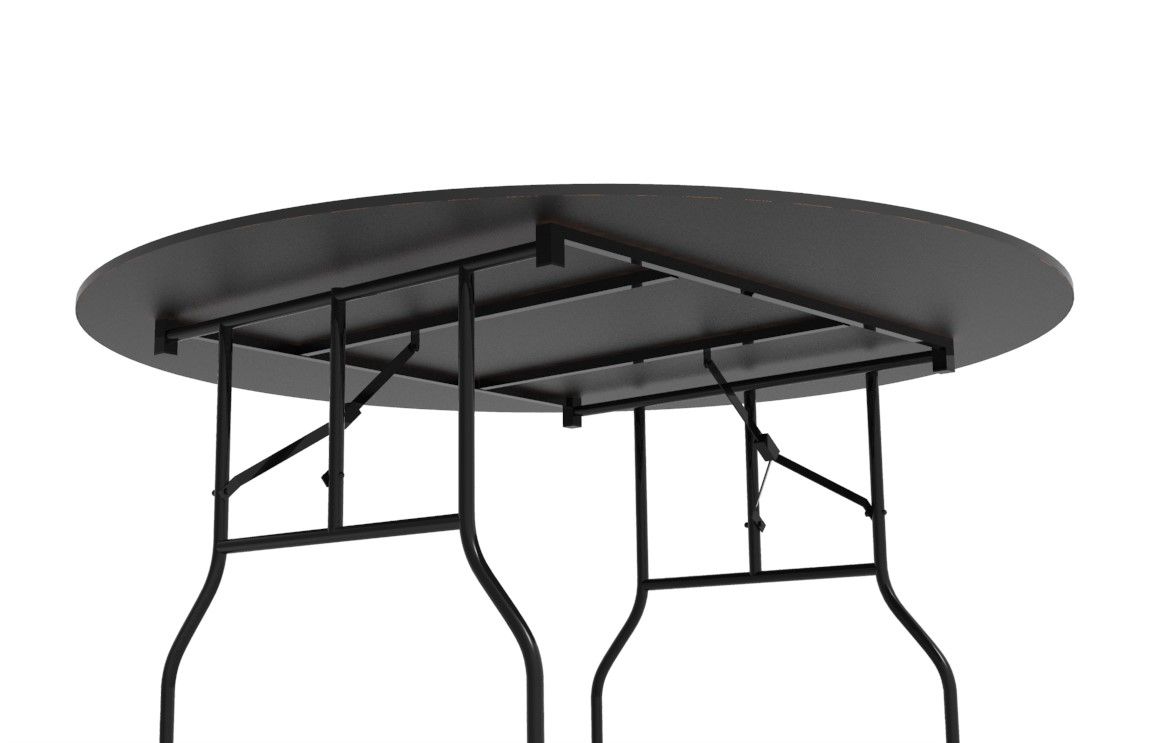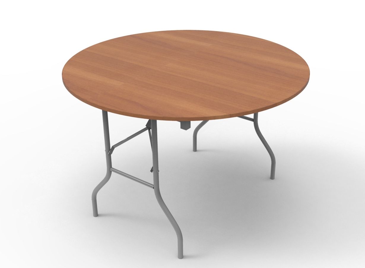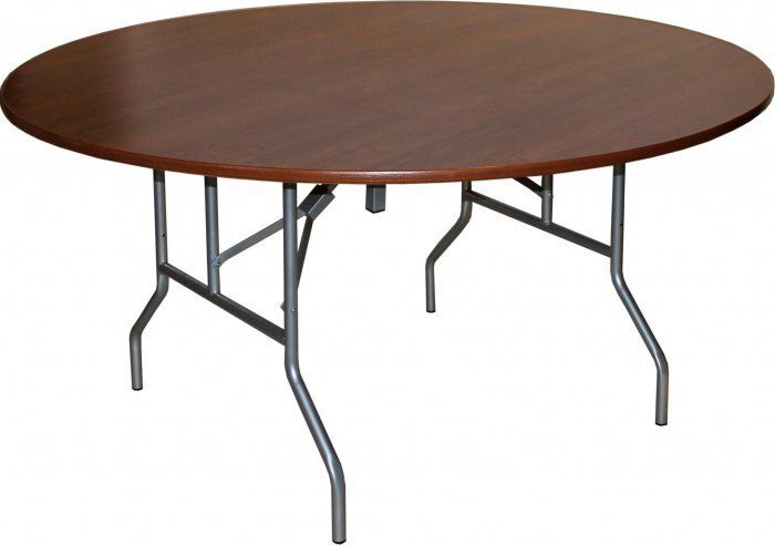 Складная мебель с жесткими распорками оснащена круглой столешницей. Пленка на рабочей поверхности (имитация рисунка ценной породы дерева) поддается влажной уборке. При эксплуатации опоры с колпачками не царапают пол.