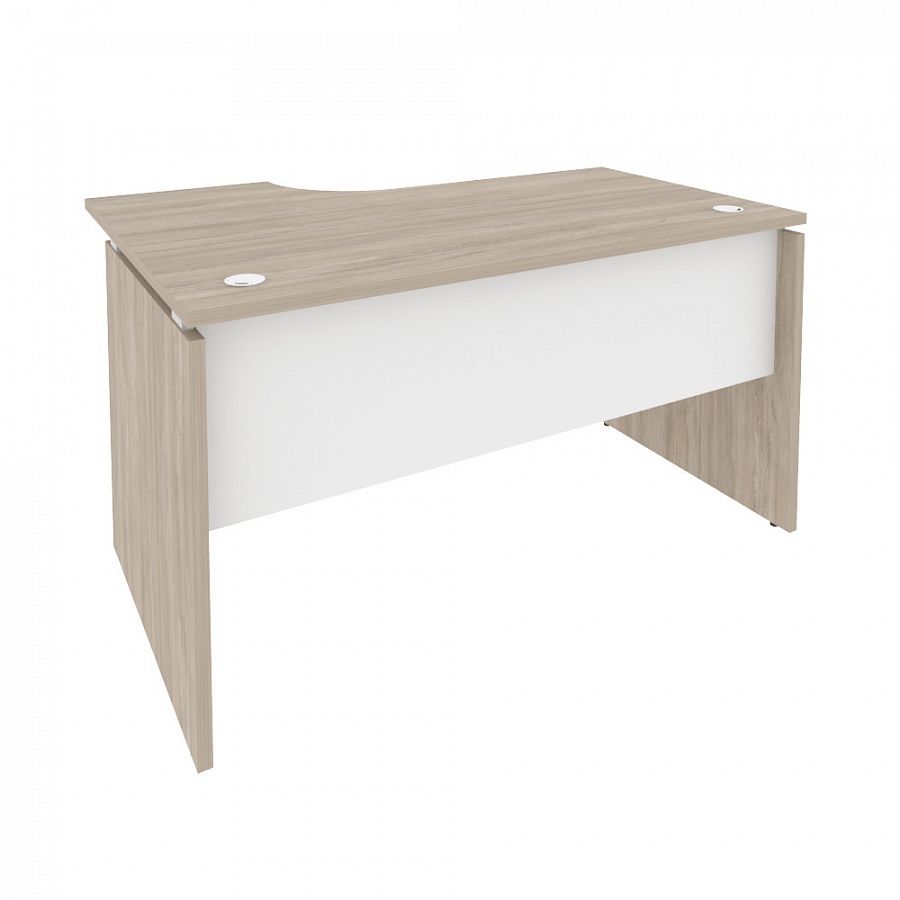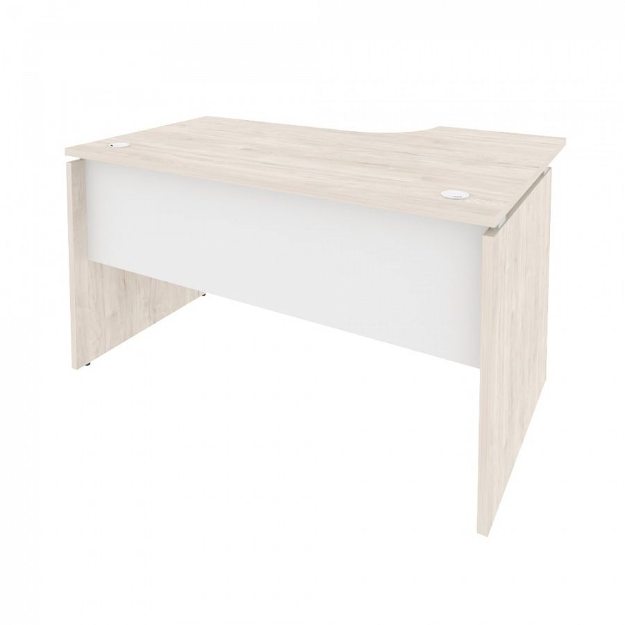 Угловой стол на П-образном каркасе оснащается столешницей с эргономичным вырезом. В комплекте 2 пластиковые заглушки для кабель-каналов и царга. Детали из ЛДСП отделаны кромками толщиной 0,4 мм и 2 мм. Пластиковые элементы на опорах с винтами регулируются под неровности пола.