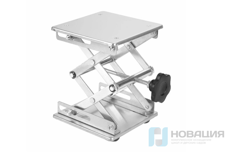 Подъемный столик позволяет менять уровень, на котором расположены приборы или их части. Расстояние корректируется за счет Х-образных опор под столешницей. Они складываются и раздвигаются вращением винта. Механизм упрощает монтажные и лабораторные работы.