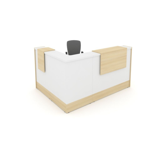 Мебельный комплекс для администратора состоит из 2-х прямых модулей, углового модуля, 2-х накладок, подкатной тумбы, металлической опоры, 2-х боковин.